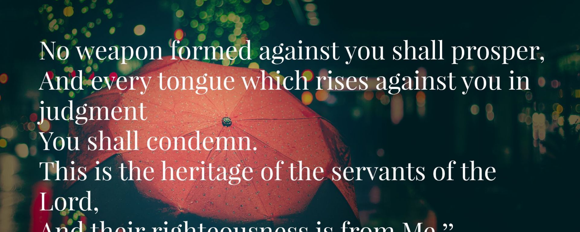 No weapon formed against you shall prosper and every tongue which rises against you in judgement you shall condemn. This is the heritage of the servants of the Lord, and their righteousness is from Me.