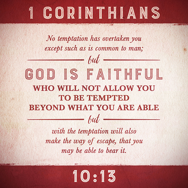 No temptation has overtaken you such as is common to man; but God is faithful who will not allow you to be tempted beyond what you are able but with the temptation will also make the way of escape, that you may be able to bear it.