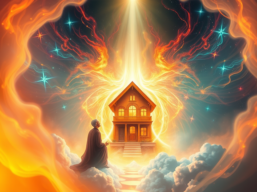 As I knelt in prayer, I was overtaken by an intense urge to pray in tongues. My spiritual language. The prayer came out with the intensity of a man with his shirt on fire. While praying, I began seeing a vision. I saw myself inside a membrane. It looked like the inside of a womb. Prayer came even more forcefully. In the vision, I began pushing against this smooth, white, bluish skin with many veins. Finally, I broke through to another place. Lights swirled and moved rhythmically in this place. At the center was a beautiful small home. The walls were painted with bright colors-red, blue, yellow, etc. I reached out and grasped the home in my hand. The vision immediately ended.